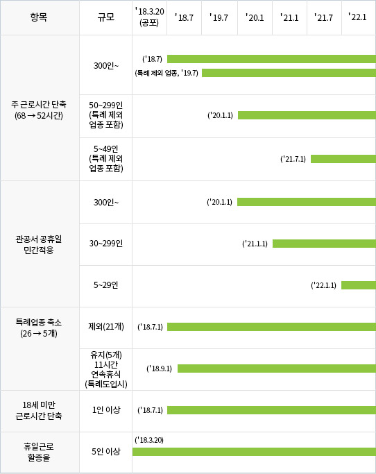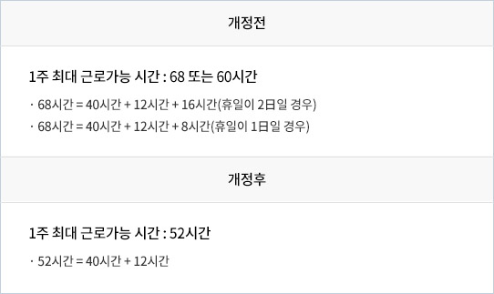 ♢ 2018년에 개정된 근로기준법에 따라 모든 사업장의 최대 근로가능 시간이 주 68시간에서 52시간으로 단축